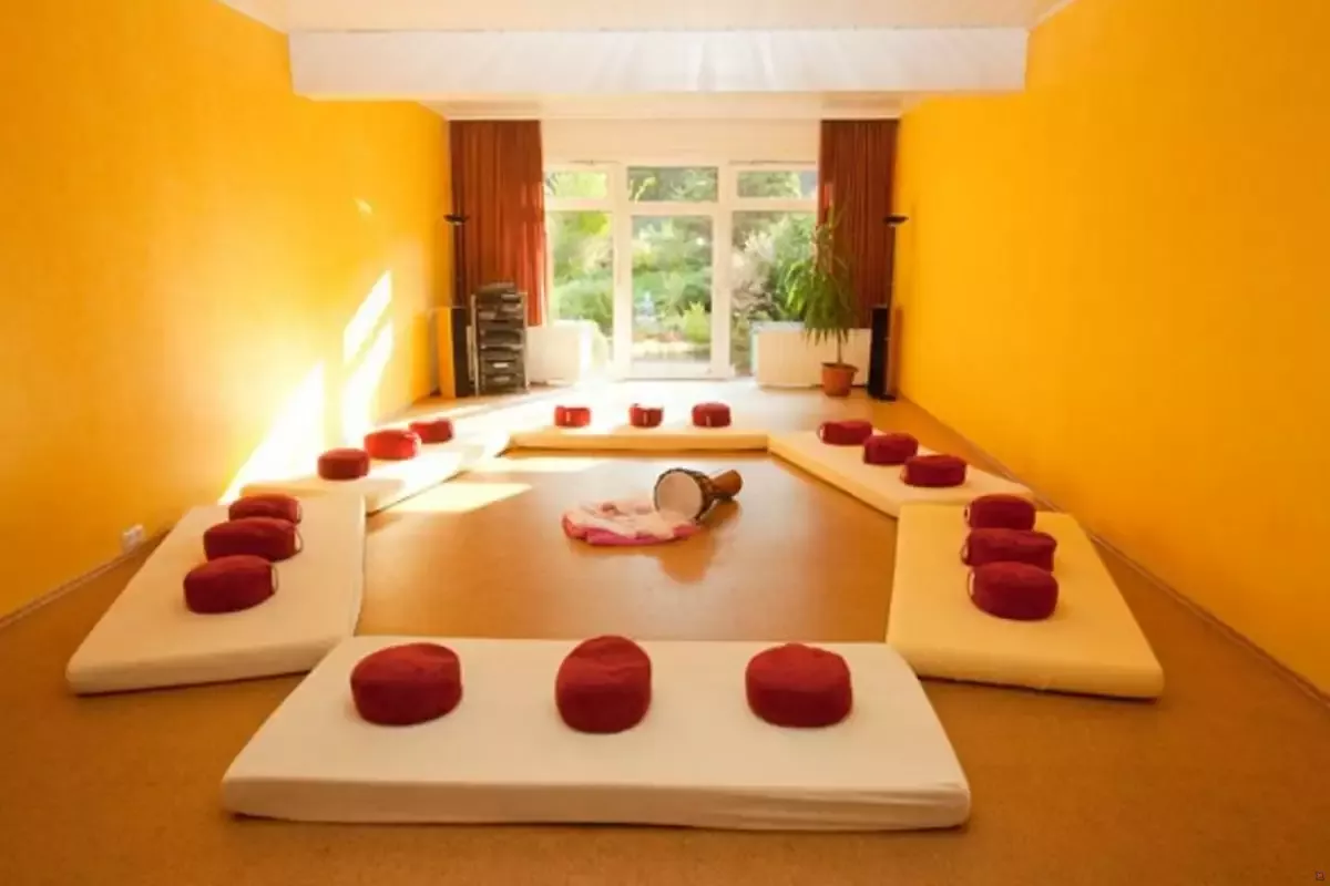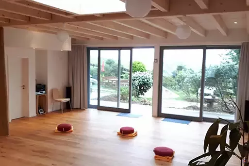 Unser Meditationsraum ist ein behaglicher, warmer Gruppenraum mit Korkfußboden und Blick zum Garten. Er strahlt eine besondere Atmosphäre von Behütet-Sein, Ruhe, Tiefe und Abge- schiedenheit aus. Ideal zum Meditieren, für Heilarbeit, Yoga und Stilletage.