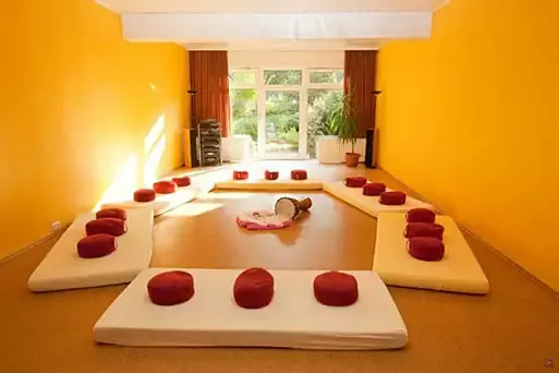 Absolute Stllle bietet unser großer Seminarraum mit riesiger Fensterfront direkt zum Wald und erfreut besonders jeden Morgenmeditierenden mit der aufgehenden Sonne. Im Januar 2015 hat dieser Gruppenraum einen neuen warmen Fußboden aus wunderschönem Echtholz erhalten. Er eignet sich vor allem für psychotherapeutische Aus- und Weiterbildungsgruppen, Tantra, Familienstellen, Vorträge und Selbsterfahrungskurse aller Art und bietet jetzt auch ideale Voraussetzungen für Tanzgruppen und Allergiker.