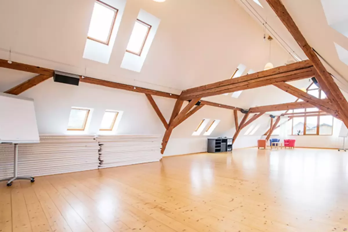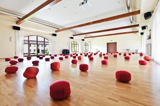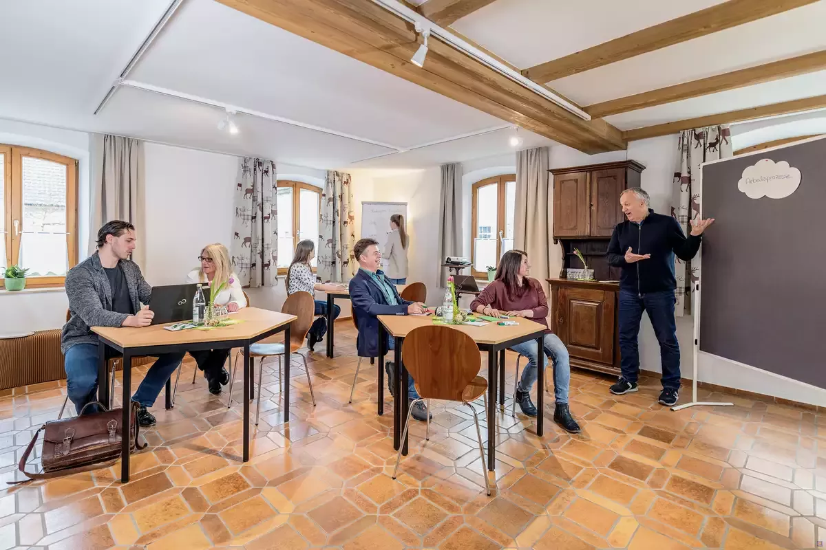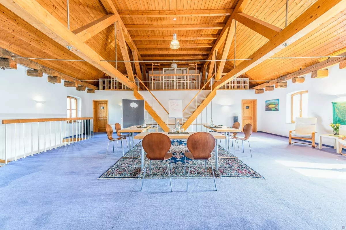 Auf Gut Helmeringen erwarten Sie drei lichtdurchflutete Seminarräume, die eine harmonische Verbindung aus professioneller Funktionalität und behaglicher Geborgenheit schaffen. Ob für konzentrierte Workshops oder stille Meditation: Die Räume sind mit moderner Präsentationstechnik und hochwertigen Musikanlagen ausgestattet. Für Ihr Wohlbefinden stehen zudem komfortable Stühle sowie weiche Matten, Decken und Meditationskissen bereit.