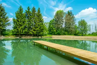Wellness & Natur: Nutzen Sie zur Regeneration unsere hauseigene Sauna und den direkt auf dem Hofgelände gelegenen Badesee – ideal für eine belebende Pause oder einen entspannten Tagesausklang.