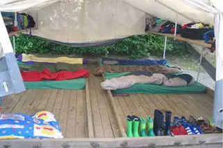 Das Sommercamp Otterndorf ist ein Zeltcamp mit vielen Annehmlichkeiten. Unsere Gäste schlafen in Großraumzelten auf soliden Holzfußboden und mit zweifach bezogenen Matratzen. Es sind bitte ein Spannbettlaken, Schlafsack und bei Bedarf ein Kopfkissen selbst mitzubringen. Jedes Zeltdorf hat ein großes Gemeinschaftszelt. In diesem werden die Mahlzeiten eingenommen. Die Verpflegung wird in unserer Campküche zubereitet und zu den Mahlzeiten in die Zeltdörfer angeliefert.