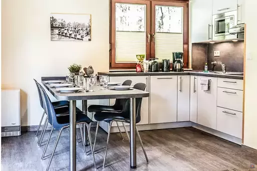 • Küche mit E-Herd, Backofen, Toaster, Kaffeemaschine, Wasserkocher