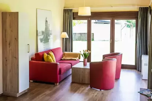 • 1 geräumiges Wohnzimmer mit Doppelausziehcouch (2 Aufbettungen), SAT-TV und Telefon