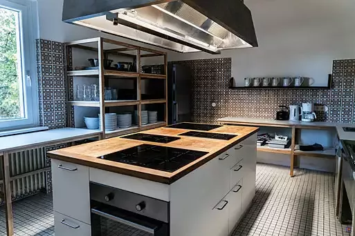 • eine große Gemeinschaftsküche, vollausgestattet mit Küchengeräten und Geschirr für 50 Personen, 2 Spülmaschinen, 2 Backöfen, 2 Kaffeemaschinen