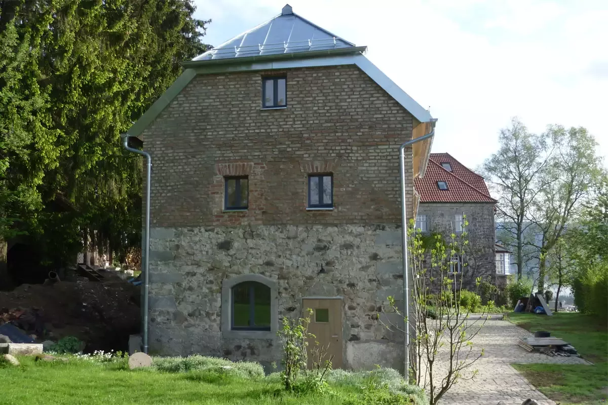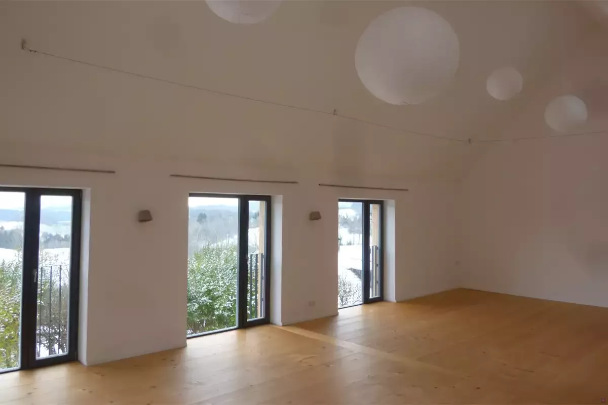 Das Nebengebäude beherbergt das helle Atelier und den großen Veranstaltungsraum - geeignet für Yoga, Meditation, Lesungen, Theater und natürlich für Tagungen, Seminare oder andere Veranstaltungen. Ein herrlicher Blick auf die Landschaft regt Fantasie und Schaffenskraft an.