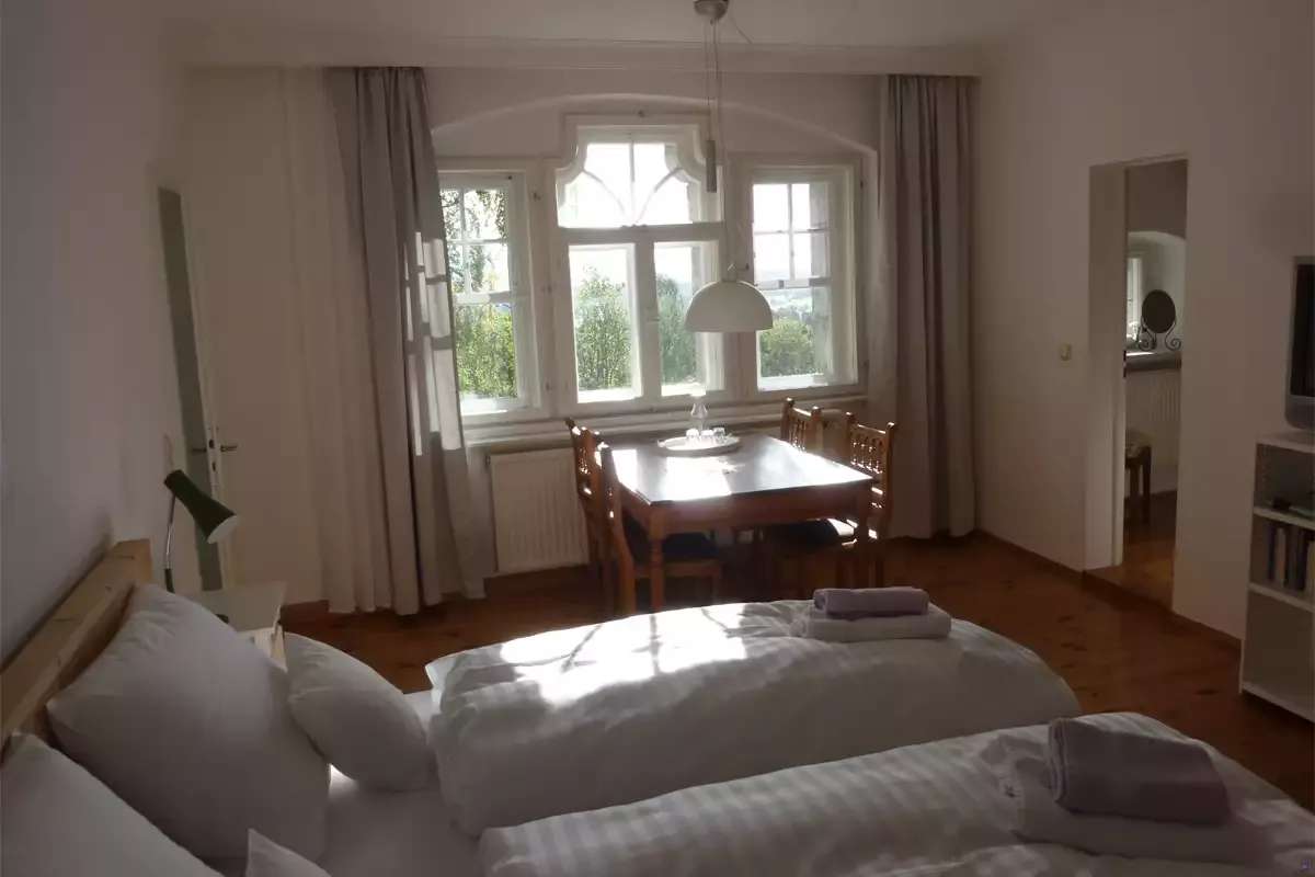 Der Salon mit zwei angrenzenden Zimmern und eigenen Duschbädern steht Ihnen, je nach Bedarf, auch als Suite zur Verfügung. Die Zimmer sind bewusst fernsehfrei. Wenn es doch nicht ohne geht, gibt es TV im Seminarbereich. Auch in der Ferienwohnung ist ein TV-Anschluss vorhanden.