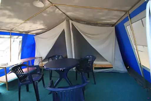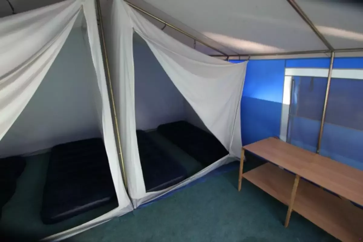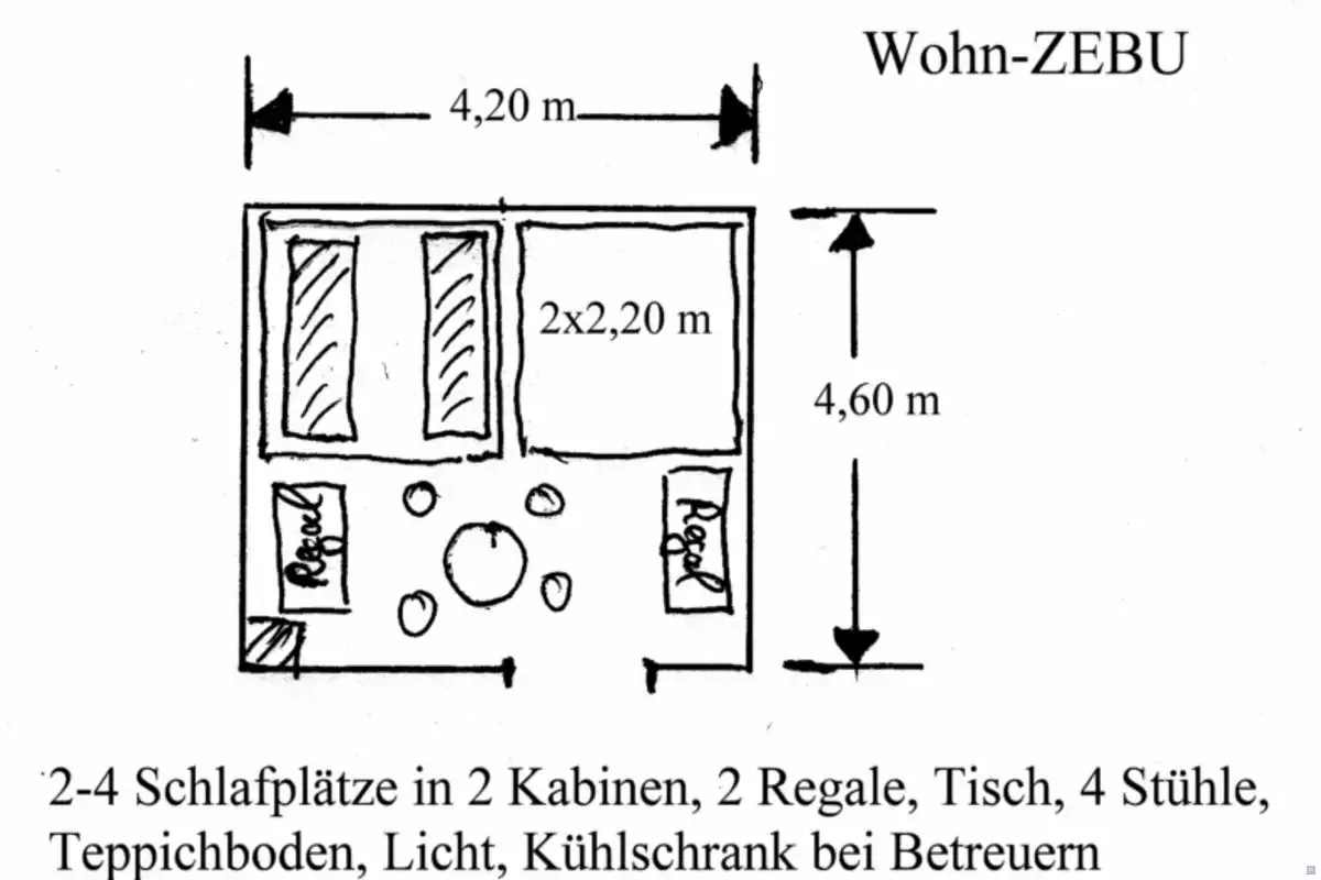 Ein ZEBU®-Zelt ist bezüglich der Schlafmöglichkeiten großzügiger gestaltet als viele Gruppenhäuser. Die empfohlene Belegung unserer Zelte liegt bei 4 Personen in den Teilnehmerzelten. Der Boden ist mit einem Teppich ausgestattet und es gibt zwei Regale, einen Tisch und vier Stühle. In den Schlafkabinen liegen jeweils zwei bequeme Velourluftbetten und in jedem ZEBU®-Zelt gibt es Licht!