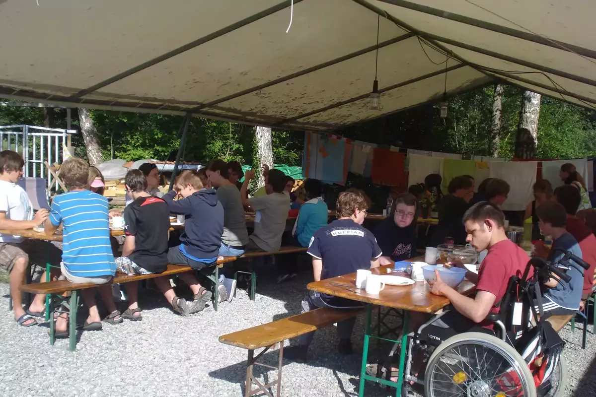 Die Zelte sind mit Holzböden und Feldbetten komfortabel ausgestattet und bieten bis zu 50 Personen Platz. Die modernen sanitären Anlagen sind so ausgelegt, dass sich auch Menschen mit Behinderung ohne Schwierigkeiten dort bewegen und versorgen können.