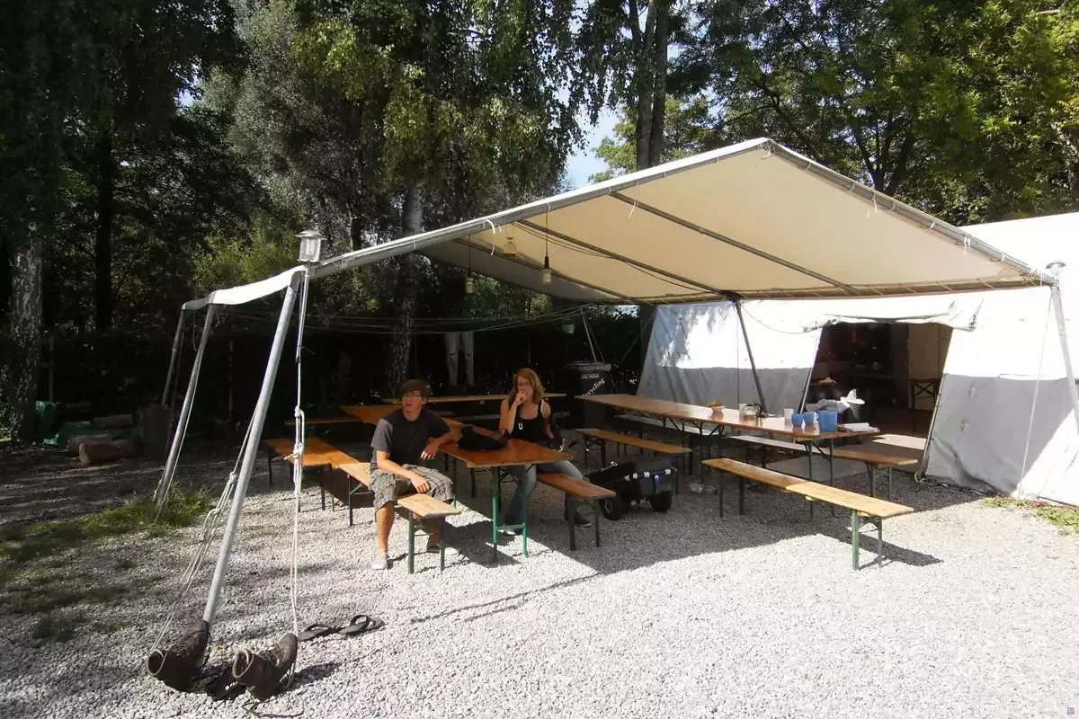 Unser Zeltdorf auf dem Campingplatz Klausenhorn bei Konstanz, das direkt am Bodensee liegt, ist mit seinen sechs Schlafzelten, einem komplett ausgestatteten Küchen-/ Aufenthaltszelt und dem großen Sonnensegel der Mittelpunkt des Gruppenlebens.