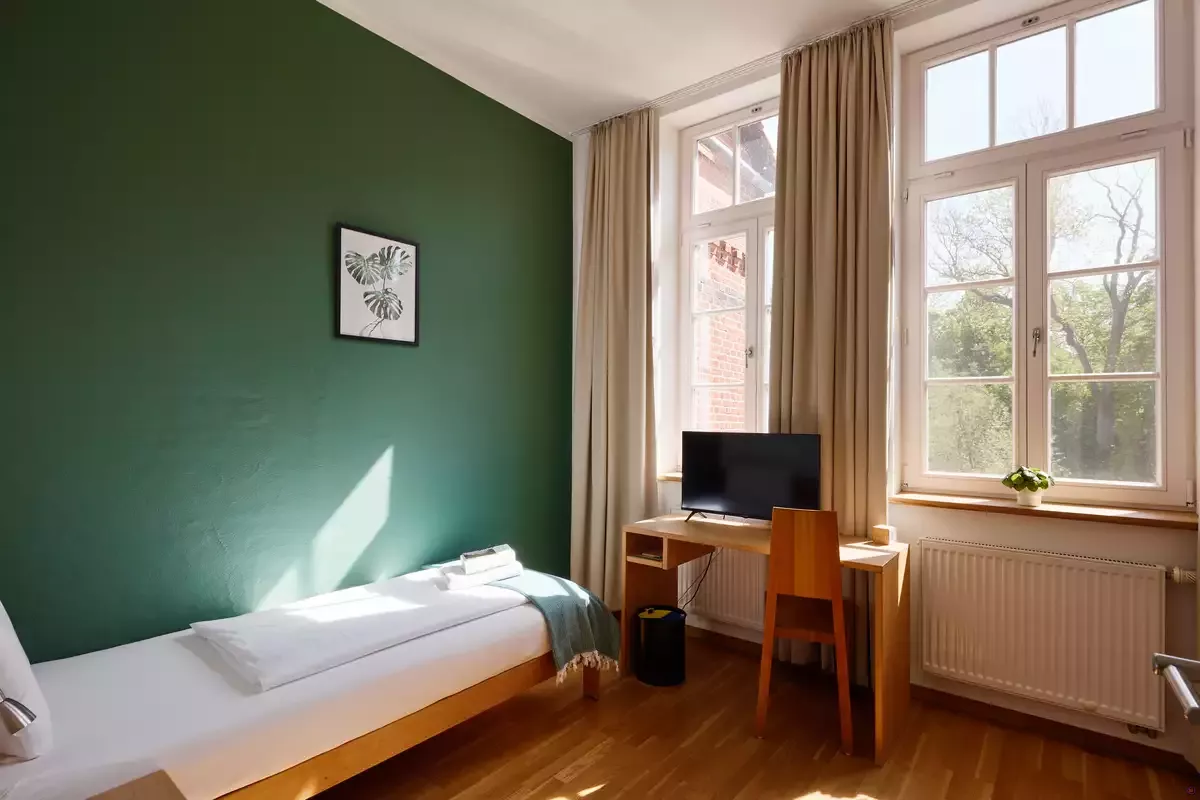 Bei uns wählen Gäste zwischen Zimmern auf der Burg und der historischen Burgschule. Alle Zimmer sind ökologisch und nachhaltig eingerichtet, mit Holzmöbeln, Smart-TV, Yoga-Matte und vielem mehr.