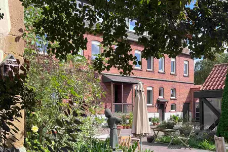 Der angegliederte Klostergarten wird geprägt von zahlreichen Apfelbäumen und den mit Buchsbaum umsäumten Wegen. Die gepflasterte Fläche vor dem Gästehaus und eine Rasenfläche können nach Absprache gern mit genutzt werden.