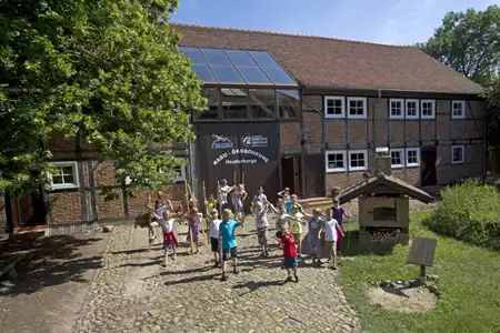In der urigen Fachwerkscheune ist unser Schullandheim mit Heuherberge und 30 Heu- sowie 14 separaten Bettplätzen zu finden. ElbeBesucherzentrum, Naturspielplatz, Bauerngarten mit Kräuterspirale, ein Hofladen mit regionalen Produkten sowie ein ElbeLandmuseum mit Flutungsmodell und Fischaquarium laden zum Verweilen ein. Unter dem Motto "Landschaft schmeckt" bieten Ihnen unser uriges Backhaus, eine Streuobst-Mosterei mit Klause sowie die "Bucher Kräuterküche" Möglichkeiten zum Entspannen und Genießen.