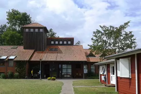 Im weitläufigen Parkähnlichen Gelände befinden sich weitere Unterbringungsmöglichkeiten in 11 Holzbungalows mit eigener Toilette; teilweise auch eigener Dusche. Weitere Gemeinschaftssanitäranlagen sind im Haupthaus vorhanden. Direkt im Gebäude befinden sich neben Bolz- und Volleyballplatz ein eigener Klettergarten mit div. Hoch- und Niederseilelementen, Boulderwand und Bogensportanlage. Verschiedene Outdoorspiele, die auch an den Strand mitgenommen werden können, sowie ein Indoorbereich mit Kicker und Billiard sorgen auch bei schlechtem Wetter für spannende Unterhaltung. Die Entfernung zum Strand (zusätzliche Rettungsschwimmerwache während der Saison) und zur umfangreich ausgestatteten Wassserportstation beträgt ca. 1 km.