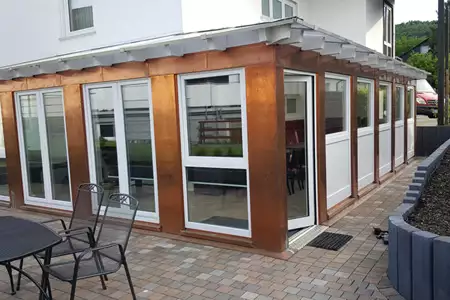Unser Haus ist in drei Etagen unterteilt. Dadurch sind sehr schöne Rückzugsmöglichkeiten gegeben. Für die Gemeinsamkeit steht ein soeben neu errichteter Wintergarten mit 35 qm und Platz für 23 Personen zur Verfügung.