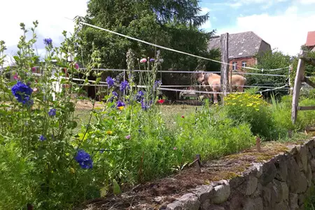 Unsere Gäste teilen sich Hof und Garten mit unseren freilaufenden Hühnern und den Katzen. Hunde, Meerschweinchen, Hasen und Pferde haben ihre eigenen Bereiche und können zu Teilen besucht werden. Dort gibt es auch mobile Sitzecken und eine Möglichkeit zum Grillen.