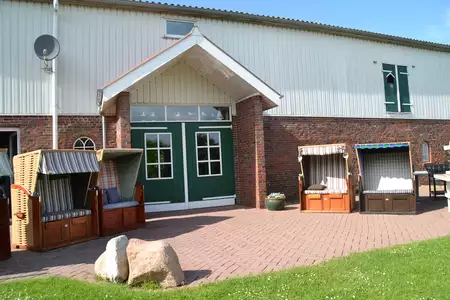 An der Südseite des Hauses befindet sich eine Terrasse (ca. 80 qm) mit Sitzmöbeln aus Holz, 3 Strandkörben und einer Sandspielecke für kleinere Kinder. Im Sommer kann die große Dielentür geöffnet werden. Vorhanden ist außerdem ein größerer Garten (ca. 3000 qm) mit Grillecke, Lagerfeuerplatz, Bolzplatz, Torwand, Schaukel und einem Volleyballnetz.