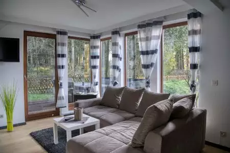 Das Ferienhaus liegt im Ferienpark am Waldsee. Das Haus befindet sich am Waldrand und hat 3 separate Wohnungen mit insgesamt 175 qm. Die oberste Wohnung hat 35 qm und eine wunderschöne Dachterrasse, die mittlere Wohnung hat 3 Schlafzimmer und 75 qm und die Souterrain Wohnung verfügt über 65 qm und 2 Schlafzimmer.
