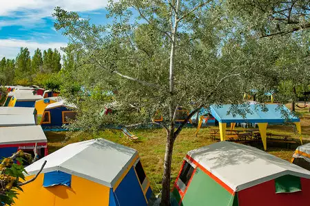 Das Beachcamp Flamingo steht innerhalb des Campingplatzes Espiguette auf einem eigenen, großzügigen Areal. Hecken trennen die einzelnen Zeltdörfer voneinander und bieten den Gruppen ausreichend Privatsphäre. Jede Gruppe bewohnt ihr eigenes Zeltdorf mit Dorfplatz. Unser Komfortcamp besteht aus Steilwandzelten für 4 Personen, ein Aufenthaltszelt und ein vollausgestattetes Küchenzelt. Die Sanitäranlagen sind in angenehmer Nähe und werden mehrmals täglich gereinigt.