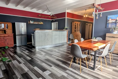 Der große Aufenthaltsraum lädt zu gemütlichen Abenden ein. Hier können Sie auf bequemen Sitzmöbeln entspannen, einen Film schauen oder einfach die gemeinsame Zeit genießen. Für kulinarische Highlights steht Ihnen eine moderne, voll ausgestattete Küche zur Verfügung. Der angrenzende Essbereich mit Bar ist perfekt für gesellige Mahlzeiten und lange Abende in fröhlicher Runde.