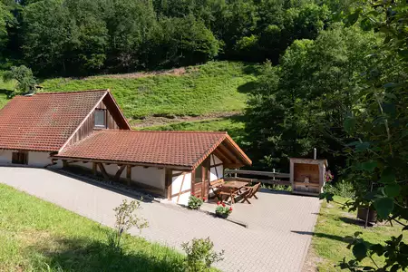 Vor der Hütte gibt es genügend Sitzmöglichkeiten, einen Flammkuchen /Pizzaofen sowie eine Grillstelle.