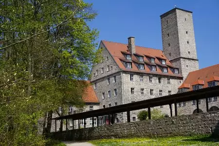 Das Jugendhaus Burg Feuerstein liegt, umgeben von Wald, auf einem Plateau oberhalt der Stadt Ebermannstad.