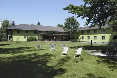 Wintergarten als beliebter Treffpunkt der Gäste, großes Außengelände mit Spiel- und Liegewiese, Spielgeräten, Grill- & Lagerfeuerplatz, zwei Gruppenräume.