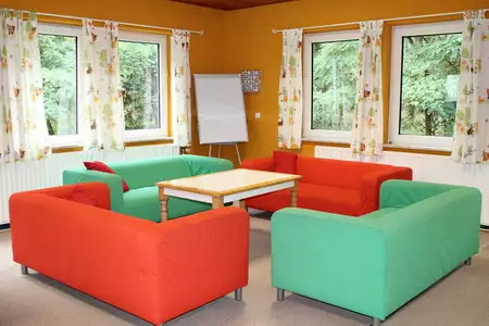 - Aufenthaltsraum für Lehr- und Betreuungskräfte mit Sofa, Fernsehgerät, Musikbox