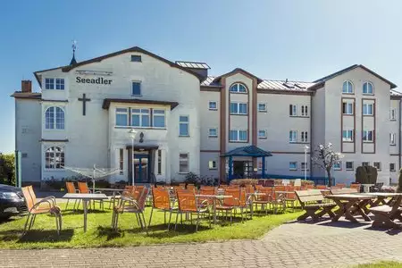 Das Haus „Seeadler“ liegt im Ostseebad Sellin, ca. 15 Minuten Fußweg vom schönen Sandstrand der Ostküste Rügens entfernt. Zwei Gästehäuser mit insgesamt 100 Betten in modernen Einzel- und Doppelzimmern oder in Familienappartements stehen Ihnen zur Verfügung. Unser Begegnungszentrum bietet ideale Bedingungen für Familienurlaub, Seniorenerholung, gemeinsame Begegnungen, Freizeitaktivitäten, Seminare und Tagungen. Das Haus „Ostsee“ gehört zu unserem Familienferienwerk und wird vom Sellin aus verwaltet. Hier stehen aktuell, nach den Modernisierungs- und Erweiterungsmaßnahmen 2012/2013, ca. 45 Betten für Familien u. a. Gästen mit einem geringen Einkommen vorrangig zur Verfügung. Im liebevoll sanierten alten Pensionsgebäude – hier überwiegend Zweibettzimmern (mit fl. warm/kalt Wasser, DU/WC neu auf den Etagen) – befinden sich im Neubau zudem ein Fahrstuhl und 4 Familienzimmer mit DU/WC. Die ideale Lage – nach 350 m erreichen Sie den feinsandigen Badestand – und die reizvolle Umgebung der Halbinsel Mönchgut bieten zudem gute Voraussetzungen für eine optimale Entspannung.