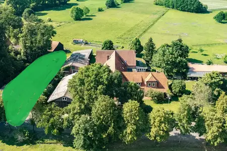Großer naturnaher Bauern-Garten mit mittelaltem Baumbestand, angrenzende eigene Koppeln und Weiden. Für Kinder: Schaukeln Stelzenhaus Sandkasten Spieltrecker