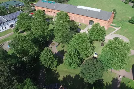 Gewölbe mit Kamin und angrenzender Bowlingbahn, Restaurant mit Terrasse, großer Festsaal, Sportplatz mit Flutlicht, Streichelzoo, Sauna und transportabler Bühne