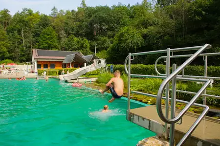 Das Naturbad mit Spielbachlandschaft lädt die Kleinsten mit ihren Eltern zum Planschen ein. Für die Größeren sorgen ein Sprungfels und eine Breitwellenrutsche für die perfekte Abkühlung.